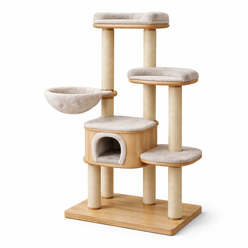 Include piattaforme a diverse altezze, casetta, amaca e cuscini rimovibili.