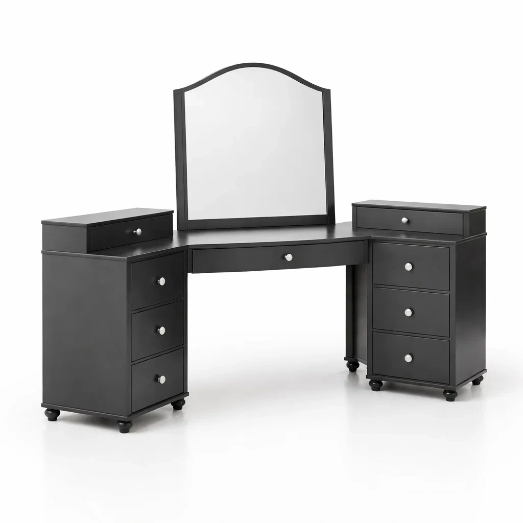 Questo tavolo da toeletta in legno offre una soluzione di archiviazione per l'interno. È dotato di uno specchio e sei cassetti per organizzare gli accessori.